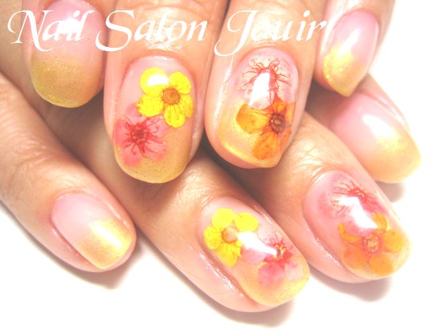 グラデーションピンク、イエロー、オレンジの3色の押し花をチョイスされました。